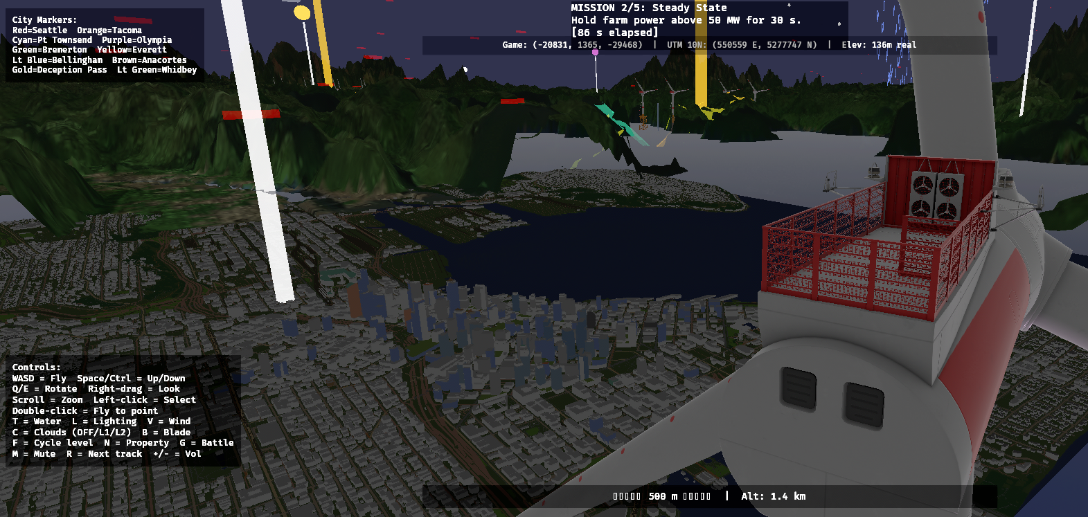 Alpha. Shipping Milestones 1-4 from the design doc — core loop, visual identity, depth, chaos. Next: Music Mode (M5) where turbines become instruments, plus localization (German/Danish/Spanish/Chinese/Japanese/Korean) and Steam demo page.