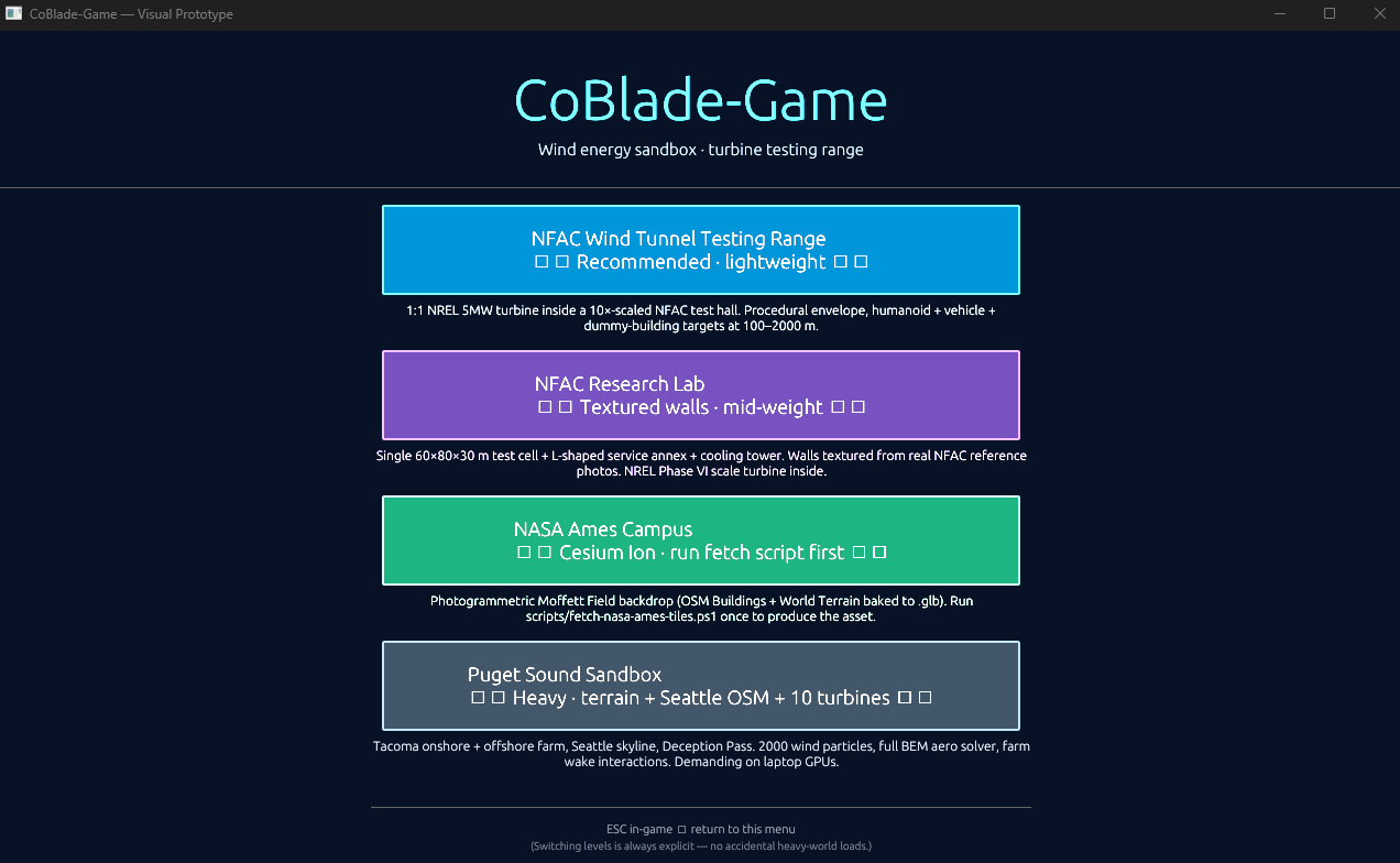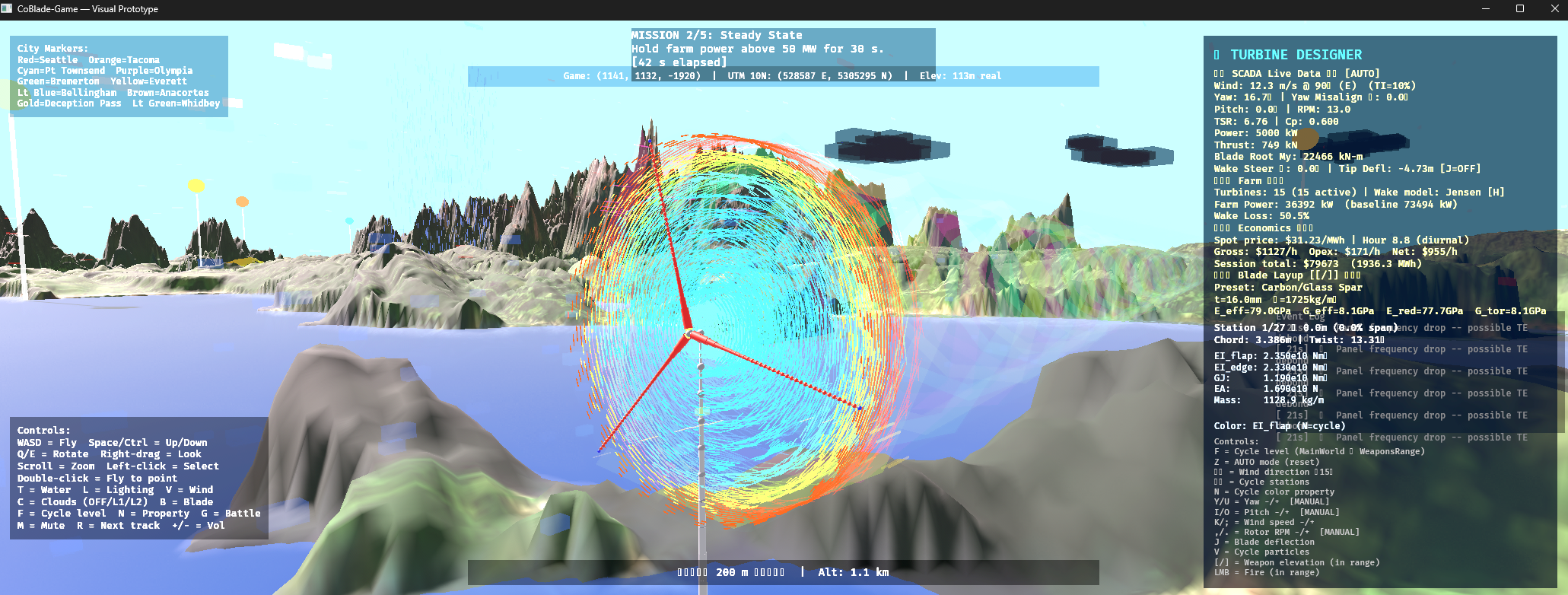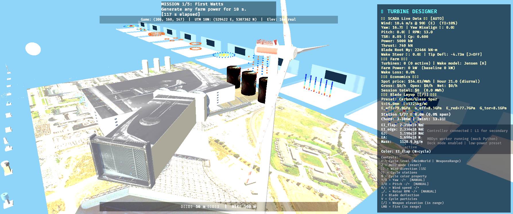 CoBlade-Game started as a visualization layer on top of a real Co-Blade structural-analysis pipeline (hence the name). Every aerodynamic and structural calculation, fatigue model, and wake deficit is physically grounded — Jensen cone wakes with Jimenez yaw deflection, Miner's-rule damage accumulation, Classical Laminate Theory (CLT) for blade design, Blade-Element Aerodynamics, Multi-Body-Dynamics (MBDyn), Vortex Particle airflow effects!